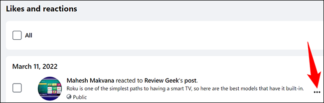 您会看到所有您喜欢或对其做出反应的帖子。在这里,找到您要删除喜欢或反应的帖子。然后,点击帖子旁边的三个点。