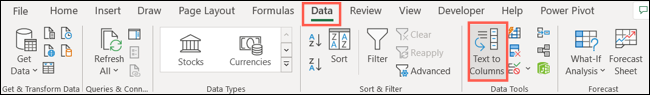 选择列,转到“数据”选项卡,然后单击功能区“数据工具”部分中的“文本到列”。
