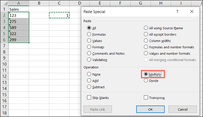 将顶部的粘贴设置为“全部”。在底部的操作下选择“乘法”。点击“确定”。