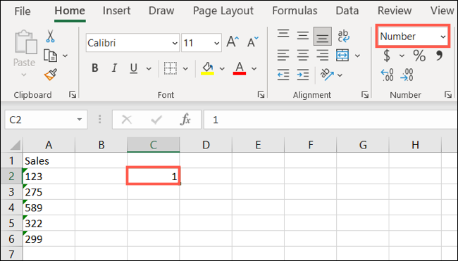 这会将格式更改为 Excel 的默认数字通用格式。您可以保持格式不变或选择单元格并在“主页”选项卡的“数字”部分中选择“数字”,如前所述。