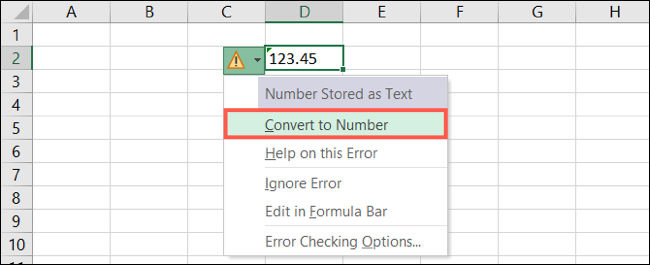 单击警告旁边的下拉箭头,然后选择“转换为数字”。