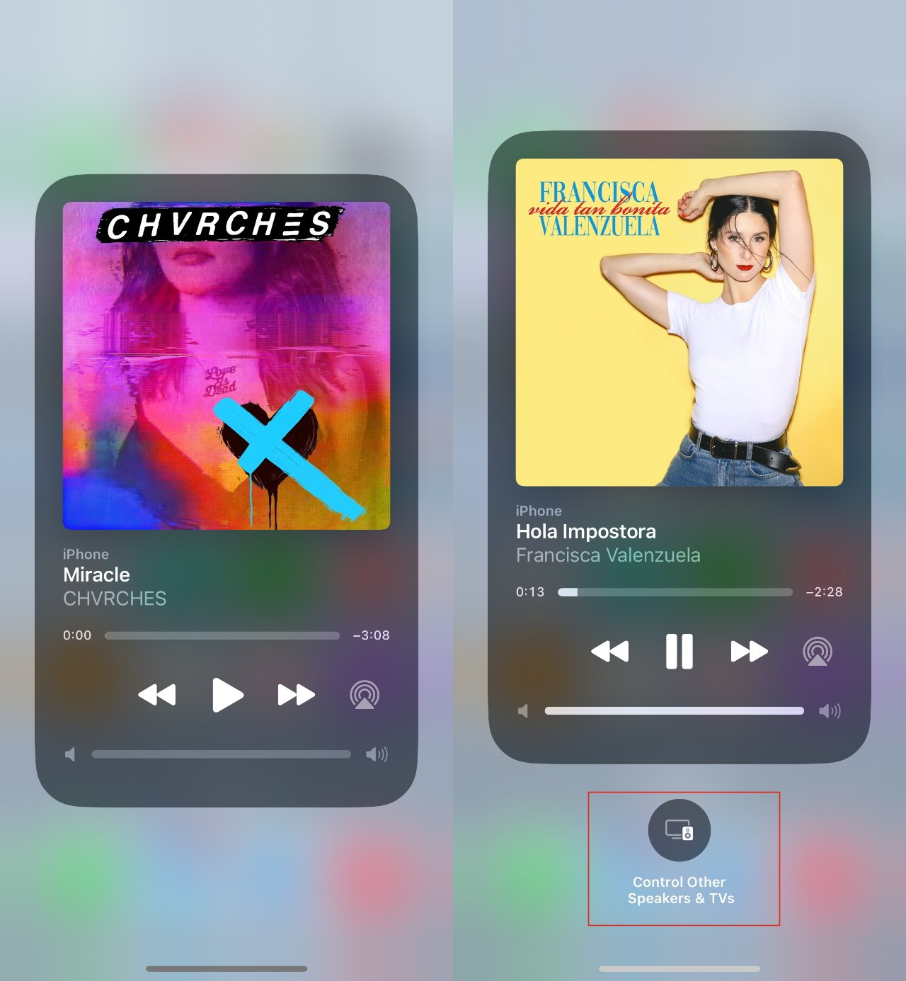请务必轻点“控制中心”音乐面板右上角的图标 – 无论该图标是“隔空播放”、此处所示还是其他任何图标。