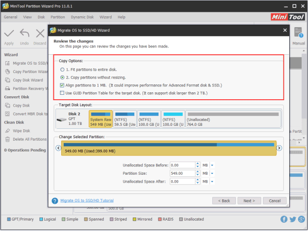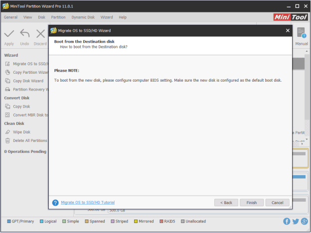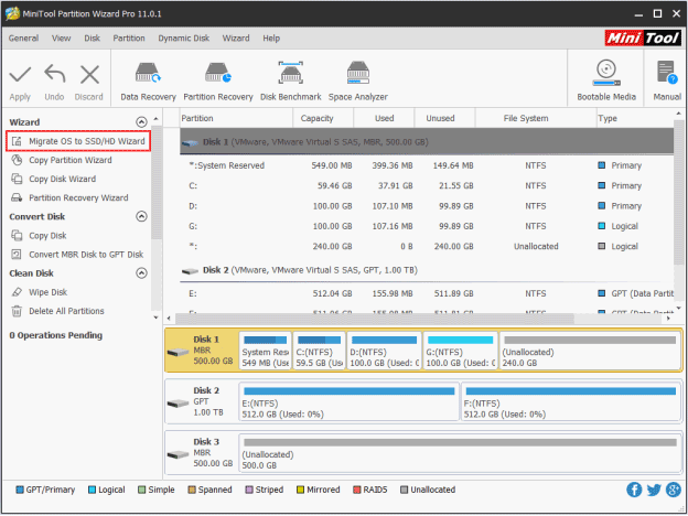 MiniTool分区向导的将OS迁移到SSD / HD向导功能可用于将Windows从HDD传输到SSD。它的免费版不支持从MBR到GPT的操作系统迁移,但专业版和更高级的版本支持它。只需从以下按钮获取MiniTool Partition Wizard Pro。