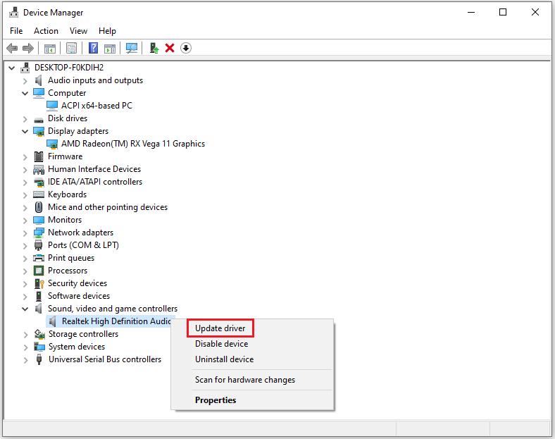 步骤3: 右键单击您的音频驱动程序,然后 从菜单中选择“更新驱动程序”。