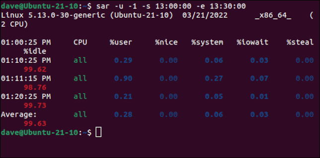 sar -u -1 -s 13:00:00 -e 13:30:00