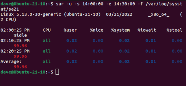 sar -u -s 14:00:00 -e 14:30:00 -f /var/log/sysstat/sa21