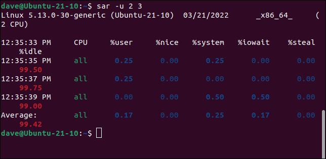 要查看间隔两秒的三组 CPU 统计信息,我们将使用此命令,该命令使用-u(CPU) 选项。请注意,间隔是第一位的。因此,此命令读取为“以两秒为步长显示三组数据的 CPU 统计信息”。