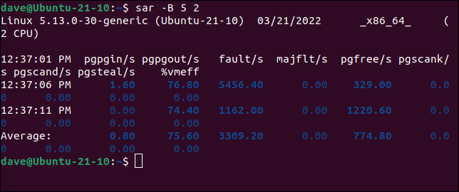 ( -Bpaging) 选项导致sar显示与内存分页到硬盘驱动器相关的统计信息。我们将要求两组信息,它们之间有五秒钟的时间。