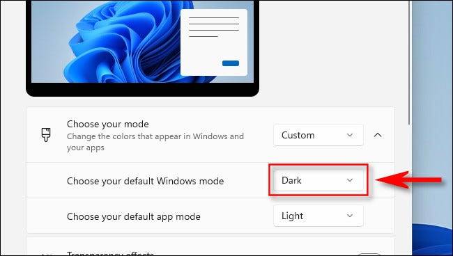 在此之下,使用“选择默认 Windows 模式”旁边的下拉菜单选择“深色”。这是一个关键步骤,可让您在前面的任务栏上应用强调色。