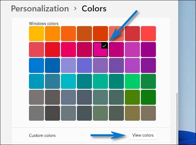 接下来,向下滚动到“强调颜色”部分,然后单击网格中您要用于任务栏的颜色。如果您没有看到您喜欢的颜色,您可以选择网格下方的“查看颜色”来选择自定义颜色。