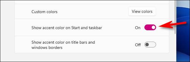 最后,将“在开始和任务栏上显示强调色”旁边的开关翻转到“开”位置。