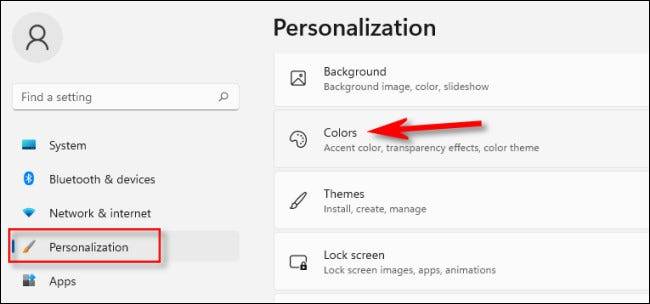 在“设置”中,单击边栏中的“个性化”,然后选择“颜色”。