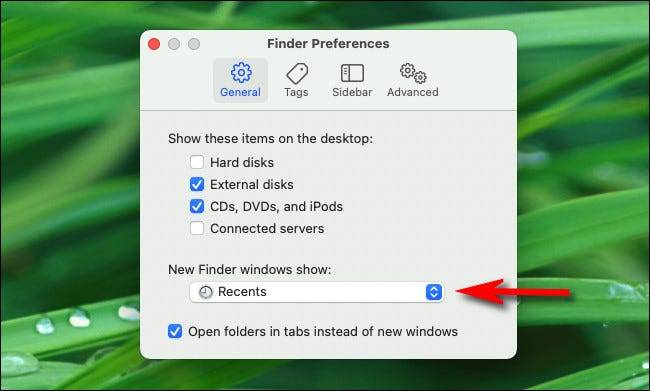 当Finder首选项打开时,单击“常规”选项卡,然后单击标有“显示新Finder窗口”的菜单。