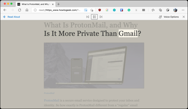 阅读器模式还具有“朗读”功能(类似于Mac上的Siri功能)。在过去的几年中,文字转语音已经走了很长一段路。使用Microsoft Edge的“朗读”功能时,您不会感觉到机器人在跟您说话。实际上,有两种声音几乎听起来像人类,具有可变的音调,适当的停顿和复杂单词的出色发音。