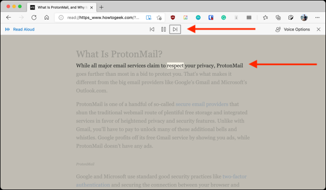 您可以通过两种方式暂停和导航语音功能。首先,您可以单击顶部的“播放/暂停”按钮。“上一个”和“下一个”按钮将帮助您跳到上一个或下一个段落。