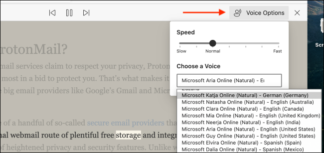 您可以从“语音选项”部分更改播放速度和声音本身。Edge拥有一个通用的库,该库具有自然发音的英语语音,可用于不同的口音(德语,日语,印度语等)。