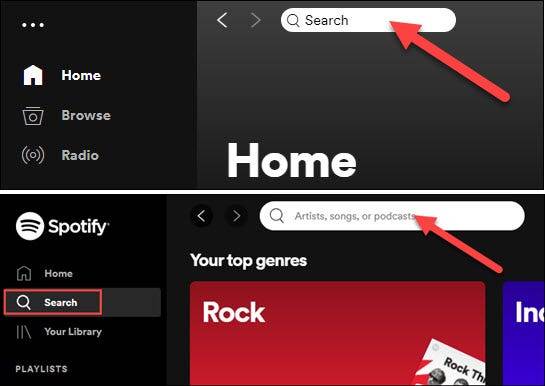 首先,打开应用程序或访问Spotify的网站。在Windows和Mac上,单击窗口顶部的搜索栏。使用网络播放器,您需要先进入“搜索”页面。