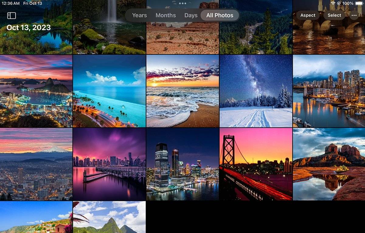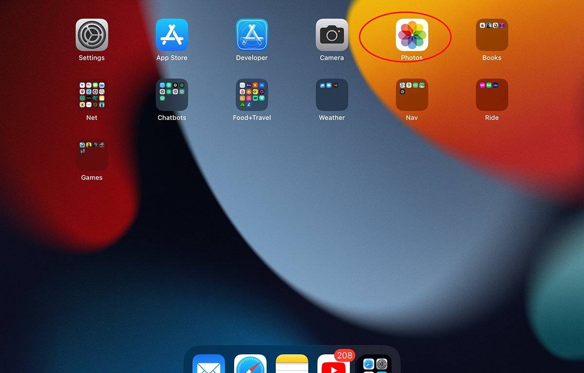 要在iPadOS上将彩色照片转换为黑白照片,请先在主屏幕中点击“照片”应用。这将打开“照片”并显示iPad上的所有照片和屏幕截图:
