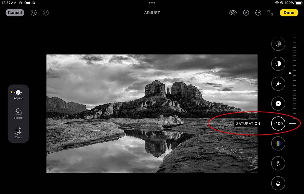 选择“饱和度”控件后,向上或向下滑动刻度线以增加或减少照片中的颜色级别。要将彩色照片设为黑白,请滑动比例,直到达到 -100 饱和度: