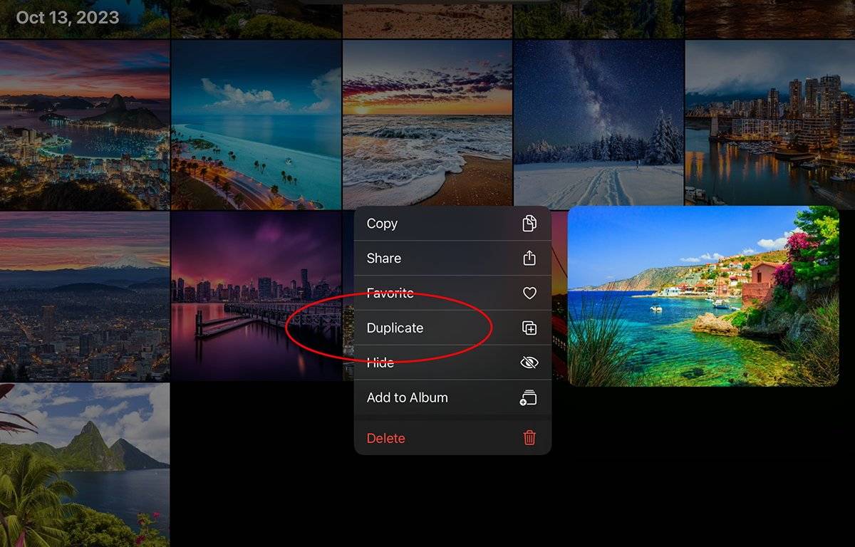 如果要先将彩色照片的副本存储在“照片”图库中,然后再将其转换为黑白,只需按住图库缩略图视图中的任何照片即可。将出现一个弹出式菜单,其中包含“重复”项目。