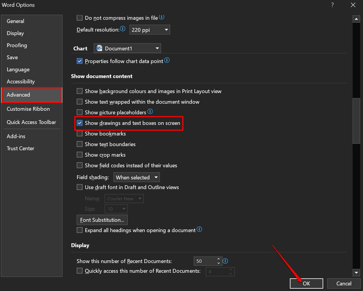 有必要允许在MS Word文档上可视化绘图和文本框。请按照以下步骤启用它。