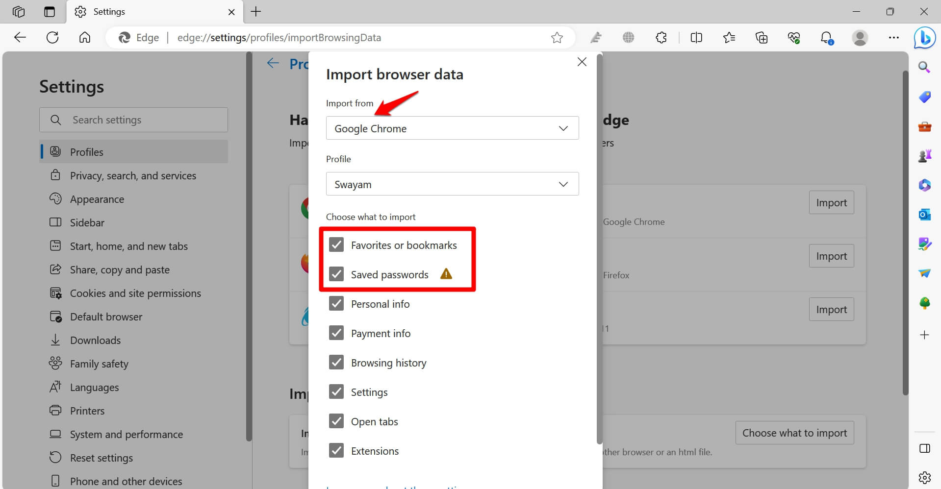 - 您还可以选择导入付款历史记录、浏览器设置、扩展程序和其他个人信息。