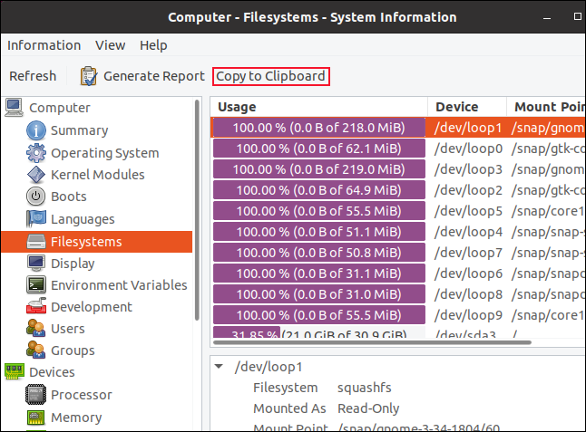 在您要复制的HardInfo应用程序中显示一些信息,然后单击“复制到剪贴板”按钮。