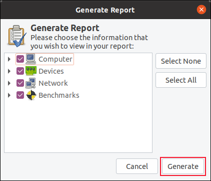 出现“生成报告”对话框。您可以选择要包含在报告中的信息类别。选择后,单击“生成”按钮。