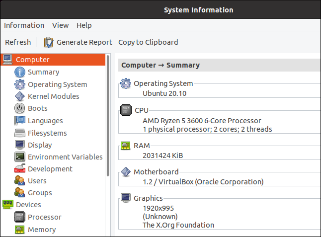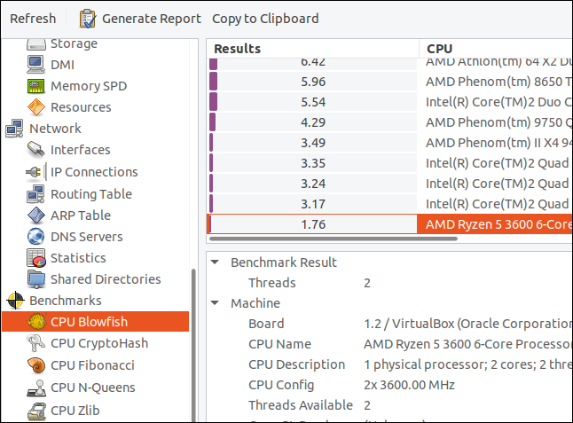 HardInfo的此副本在Ubuntu虚拟机上运行,因此某些结果有些奇怪。创建该虚拟机时可以访问两个主机CPU核心。因此,尽管该CPU被正确识别为AMD Ryzen 5 3600 6核心CPU,但仅列出了两个核心。