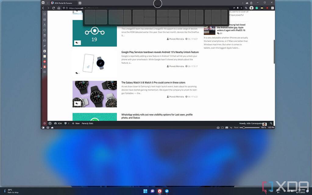 最后,虽然它不一定是触摸专用手势,但值得一提的是,现在有一种方法可以在 Windows 11 版本 22H2 中使用触摸来访问 Snap 布局。当您触摸窗口的标题栏并将其拖动到屏幕顶部附近时,将出现一系列 Snap 布局,您可以将窗口拖动到任何可用空间中以开始创建所需的布局。