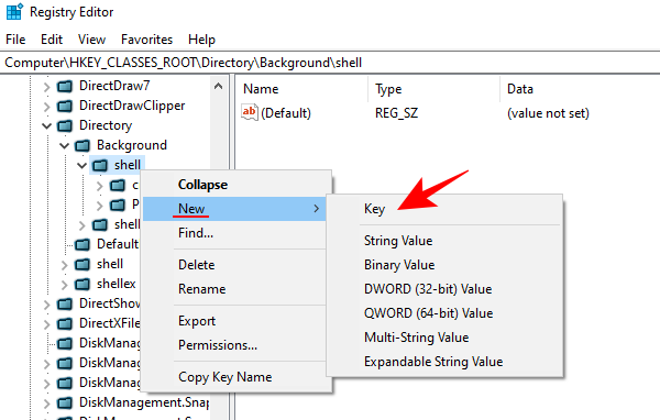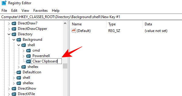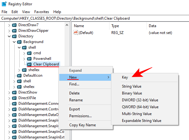 - 现在,右键单击此“清除剪贴板”文件夹,选择“新建”,然后选择“键”。