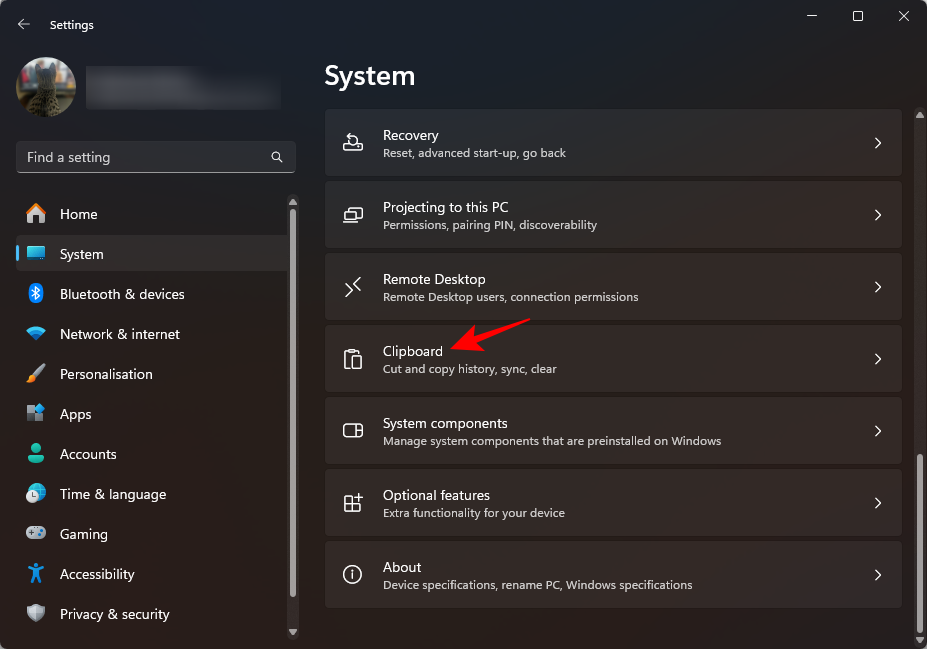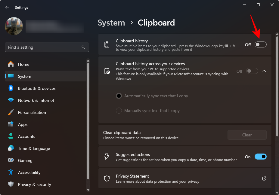Win+I打开“设置”,然后转到“系统”>“剪贴板”。 - 关闭“剪贴板历史记录”按钮。