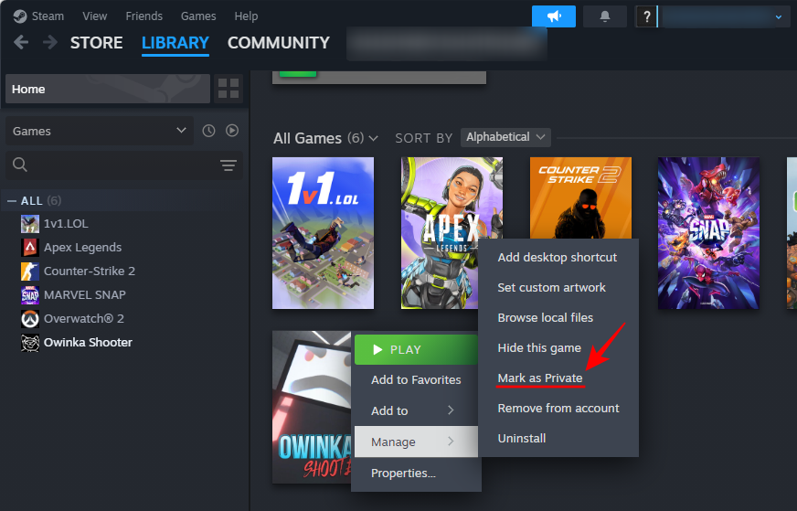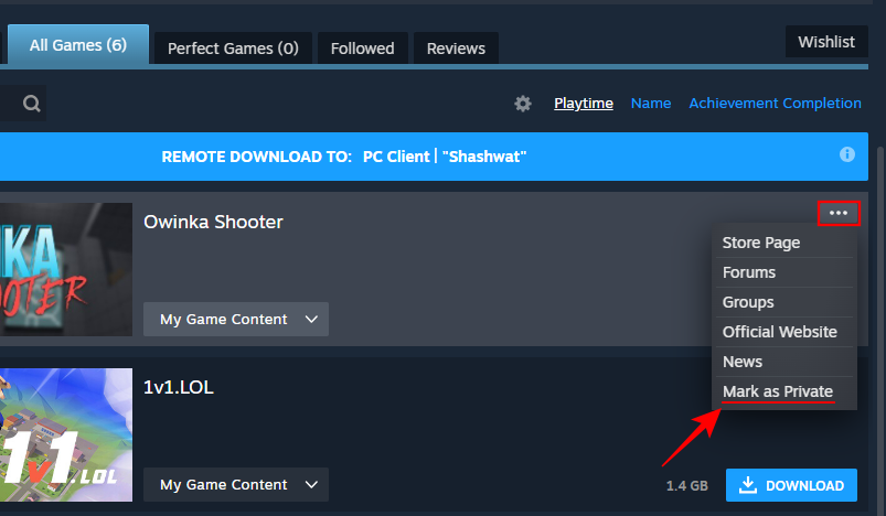 - 单击游戏旁边的三点图标,然后选择标记为私有。