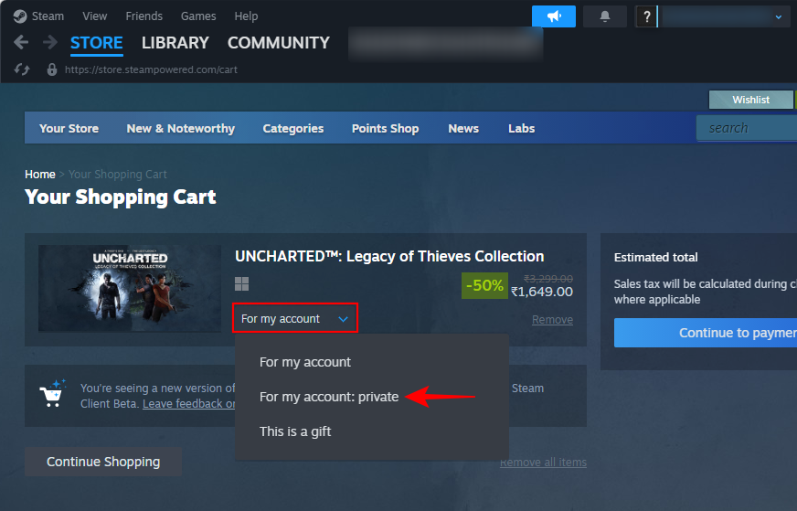 注意:从购物车中将游戏标记为私人游戏目前只是一项测试版功能。要获得 Steam 测试版,请前往 Steam >设置>界面>客户端测试版参与。