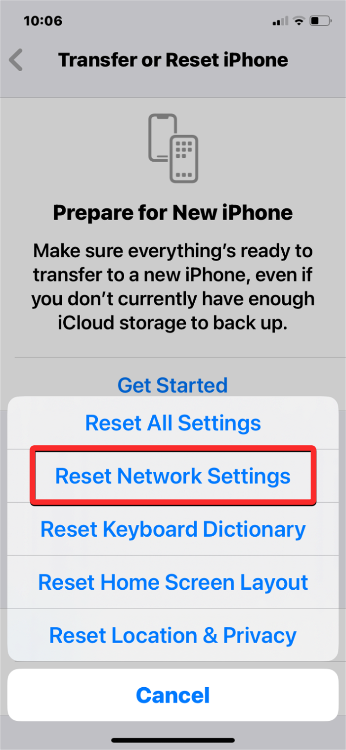 您可以通过重置当前网络设置来擦除所有无线连接的配置数据。为此,请转到“设置”>“常规”>传输或“重置iPhone”>“重置”>“重置网络设置”>“重置网络设置”。