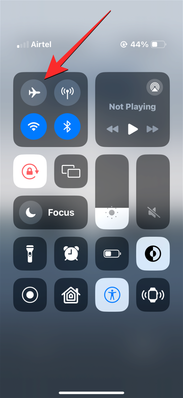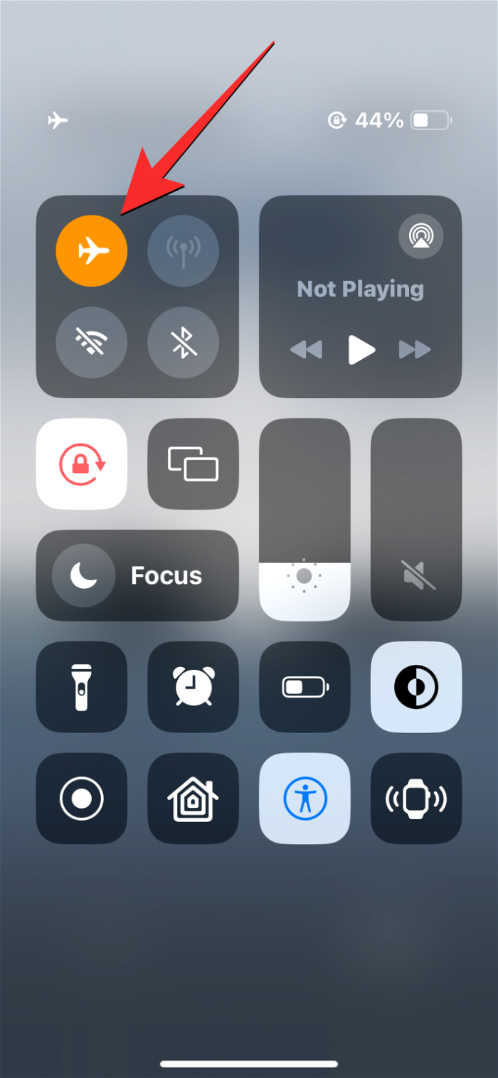 解决“仅SOS”问题的下一件事是断开无线连接以刷新。为此,请在iPhone上启动控制中心,然后点击“飞行”按钮。当此按钮变为橙色时,请等待几秒钟,然后再次点击“飞行”按钮。重置无线连接后,检查您的 iPhone 现在是否连接到网络。
