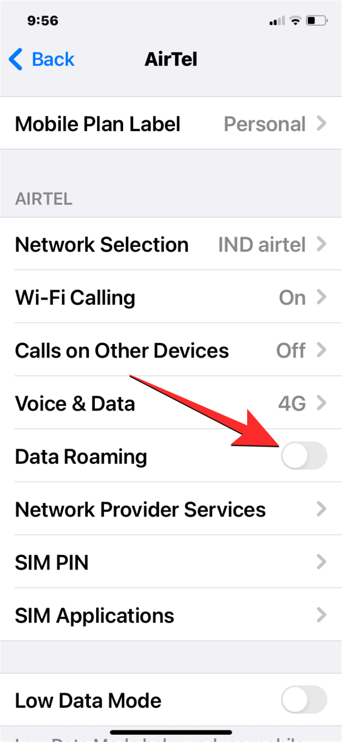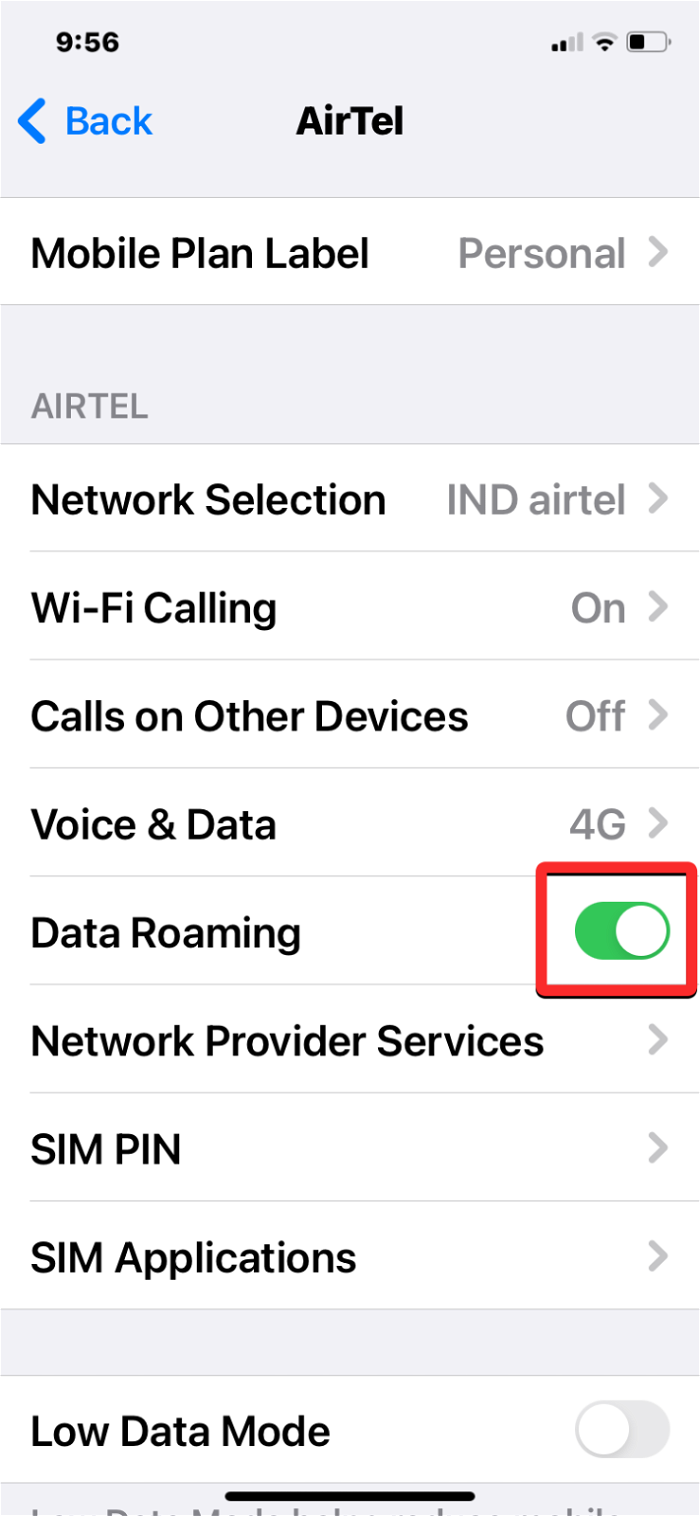 如果您要在您所在地区以外的地方旅行,则可能是由于数据漫游功能被禁用,您的 iPhone 无法连接到网络。若要解决此问题,请转到“设置”>“移动服务> SIM 卡”>选择您的 SIM 卡并打开“数据漫游”开关。
