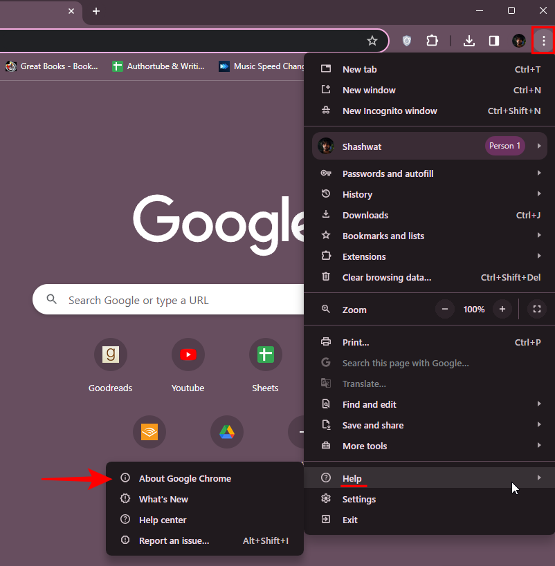 - 单击右上角的三点图标,然后转到“关于 Google Chrome”>帮助。