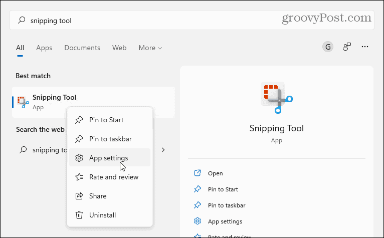 - 点击键盘上的Windows 键,键入snipping tool,然后右键单击Best match下的顶部结果。