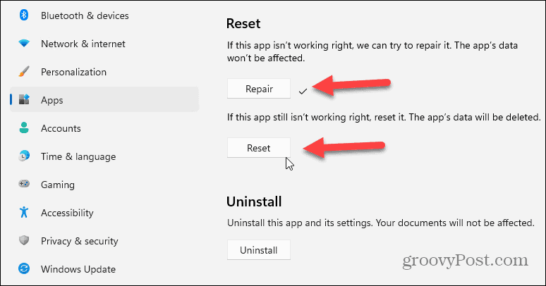 - 向下滚动到上面显示的修复和重置部分,然后单击卸载两次以进行验证。