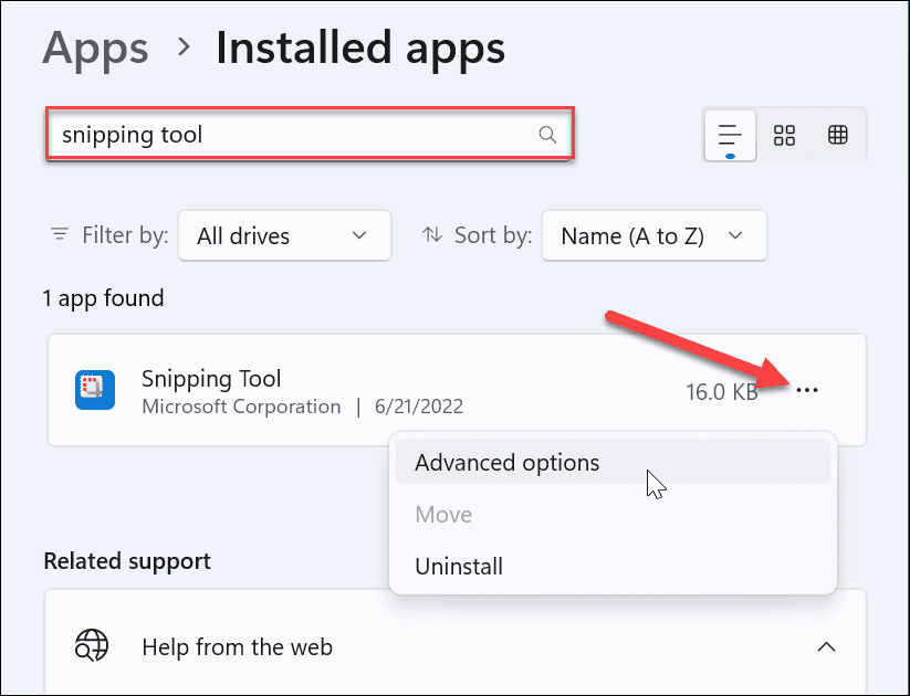 - 在搜索应用程序字段中输入截图工具,单击三点菜单,然后从菜单中 选择高级选项。