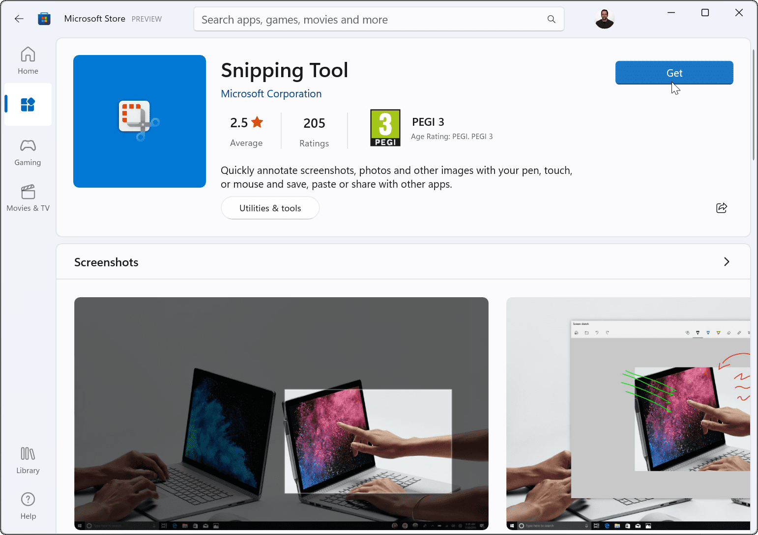 - 搜索截图工具并单击它旁边的获取按钮以重新安装截图工具的全新和更新版本。