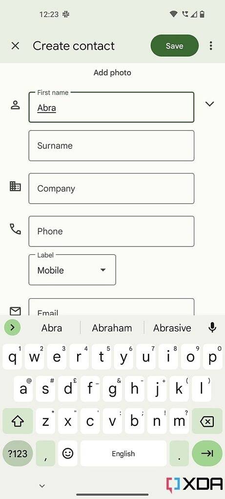 - 打开联系人应用程序并创建一个名为“Abra”的新联系人。