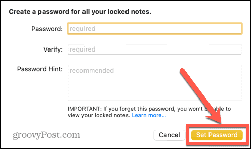 与 iPhone 和 iPad 一样,如果您没有设置密码,系统会提示您在第一次尝试锁定笔记时创建密码,但您可能更愿意先完成这一步。