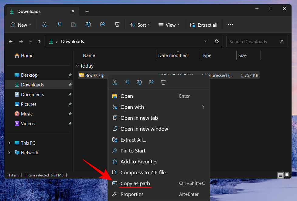 - 首先,导航到您的压缩文件,右键单击它并选择复制为路径。