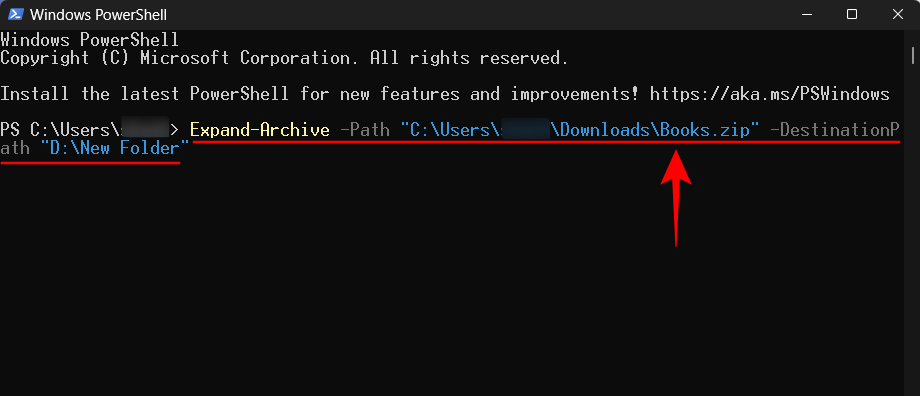 PowerShell 还可以在 Windows 11 上只需一个命令即可提取您的文件,但您必须输入文件的源路径和目标路径。这是如何去做的:
