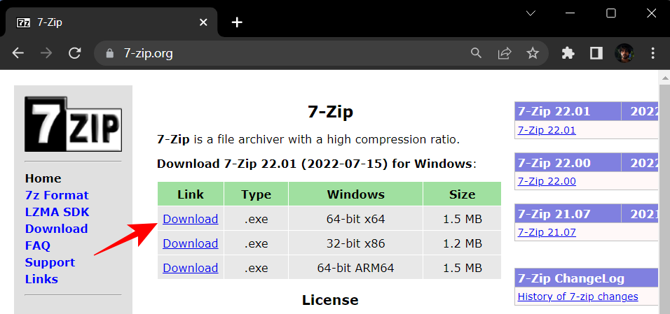 - 单击上面的链接转到 7-zip 的下载页面。然后单击第一个下载链接。
