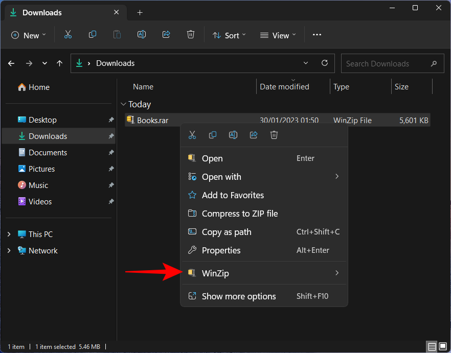 - 现在只需右键单击您的存档文件,您就会在此处找到 WinZip 选项。