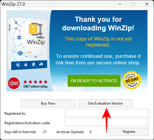 - 解压时,由于是免费版本,WinZip会要求您购买或“使用评估版”。单击后者继续。