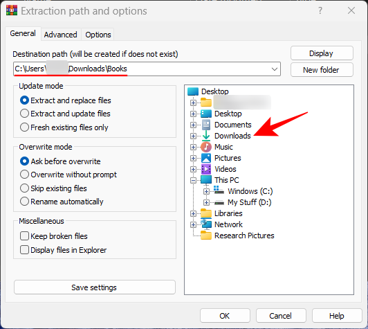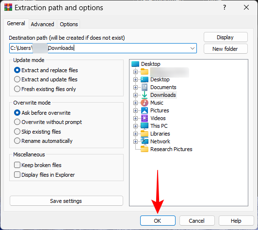 您现在已经熟悉了这些选项。但是WinRAR的“提取文件”选项的配置窗口是不同的。以下是选择“提取文件”选项来配置提取设置时要执行的操作: